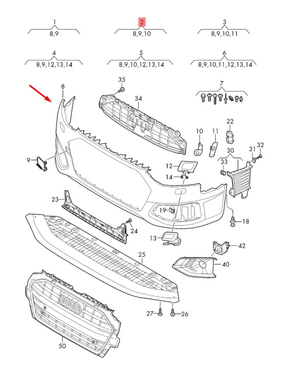 Бампер передний Audi A4 2015-2023 рестайлинг, с отверстиями под парктроники 4 шт, с отверстиями под омыватели Тайвань (TW)